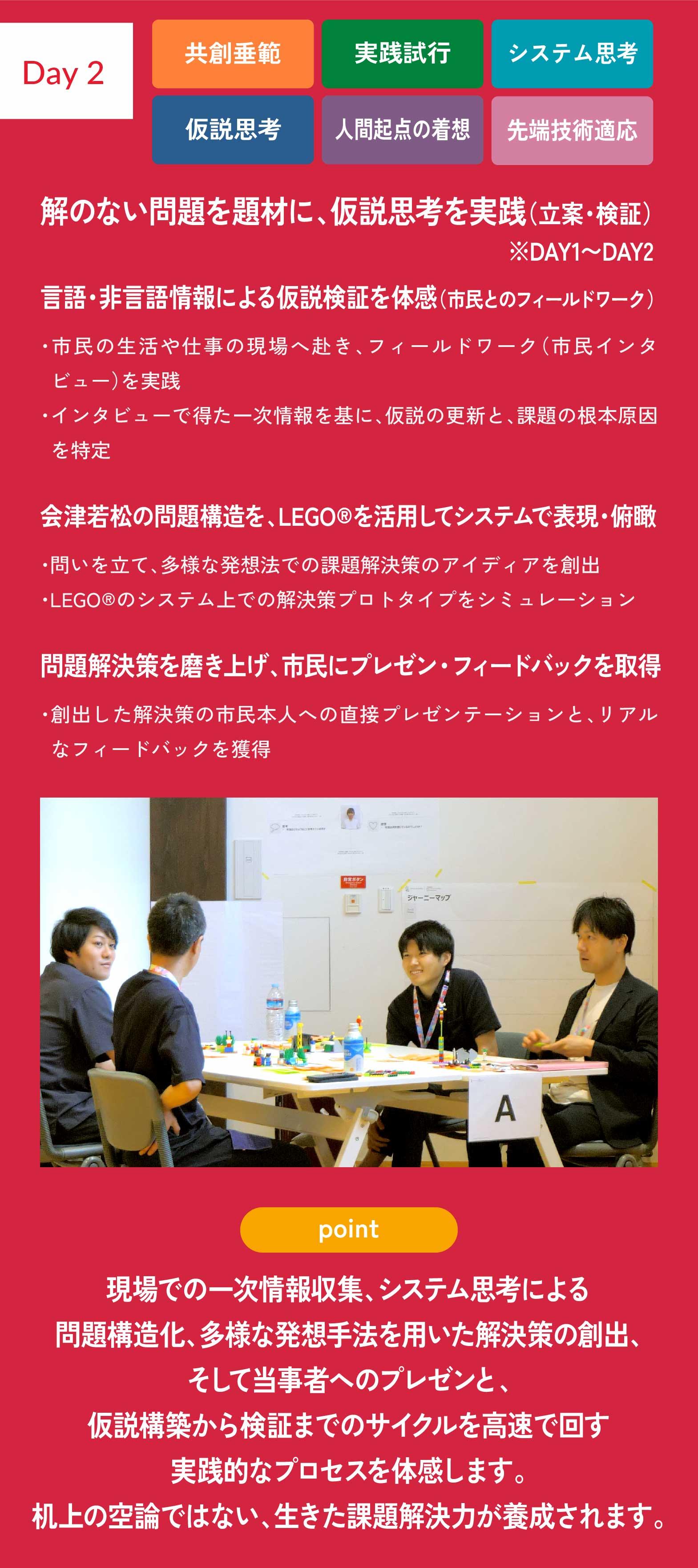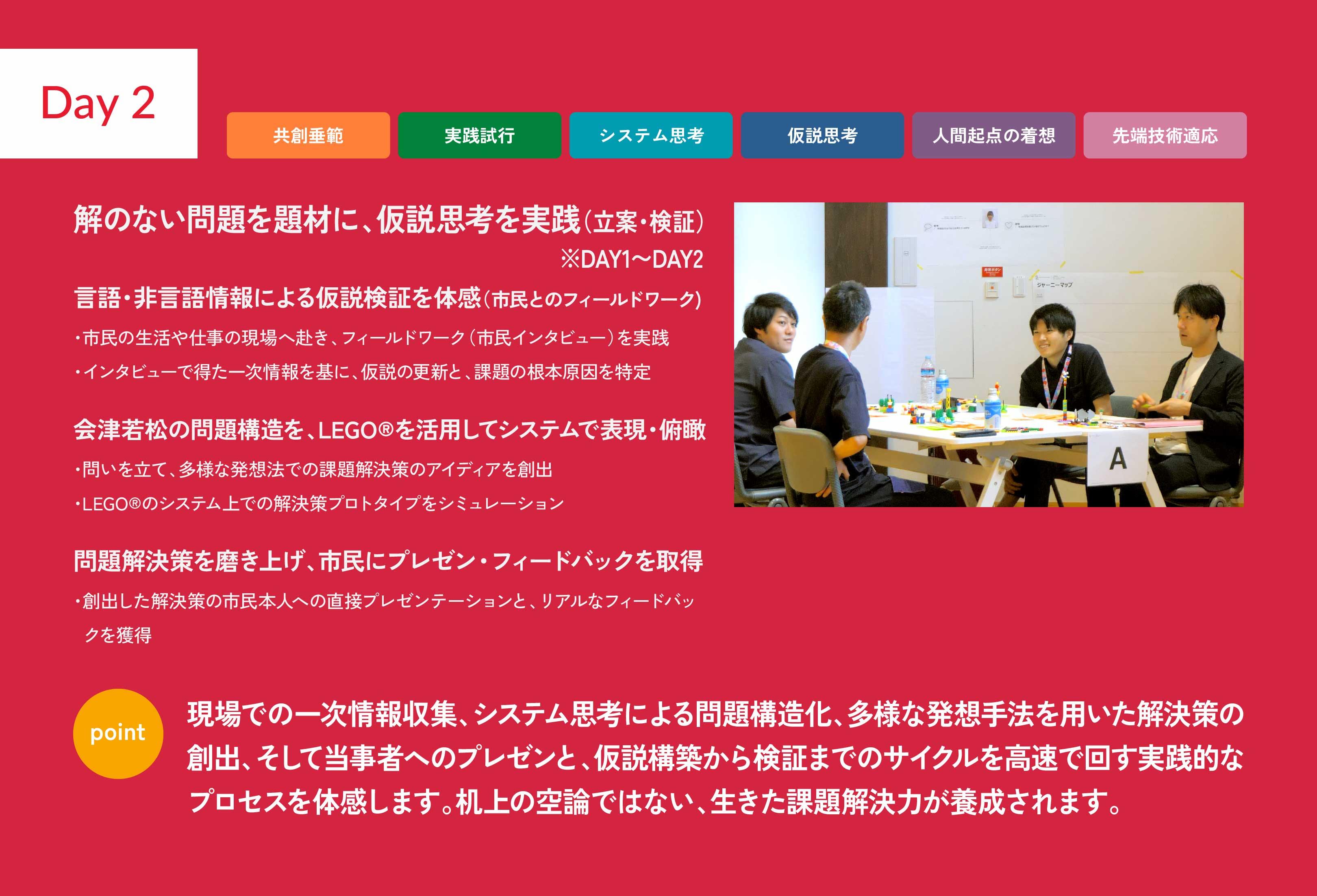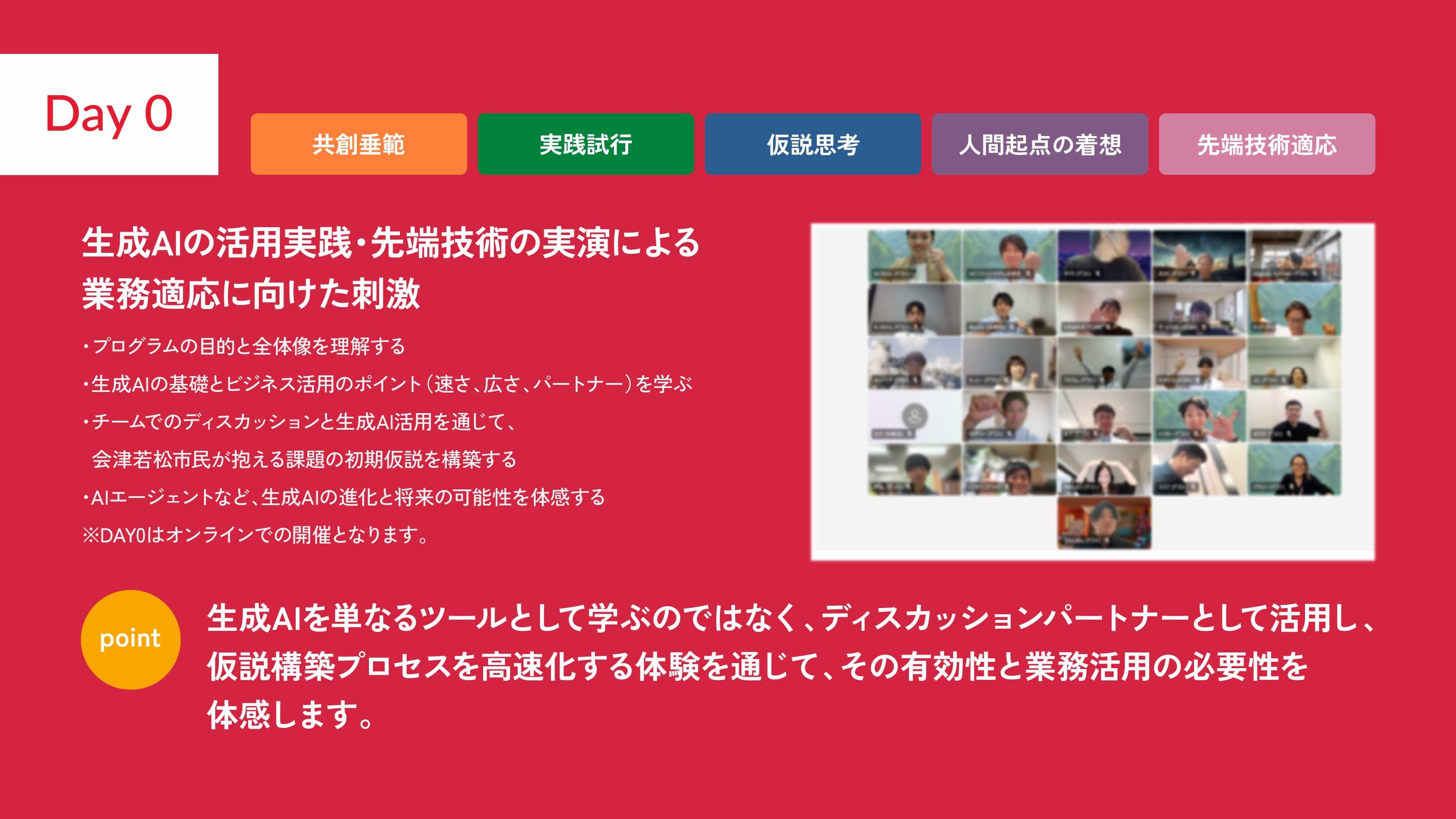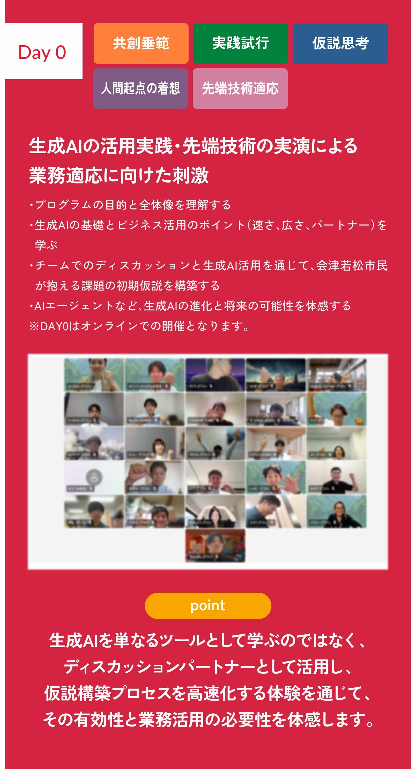 会津若松での合宿形式で、フィールドワークグループディスカッションなど実践的な内容を想定 ※DAY0およびDAY4はオンラインで実施 |