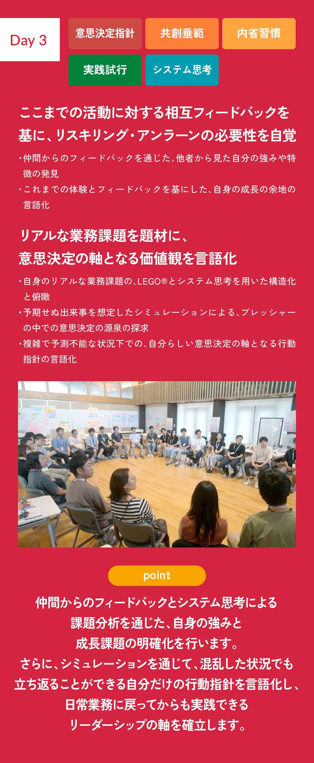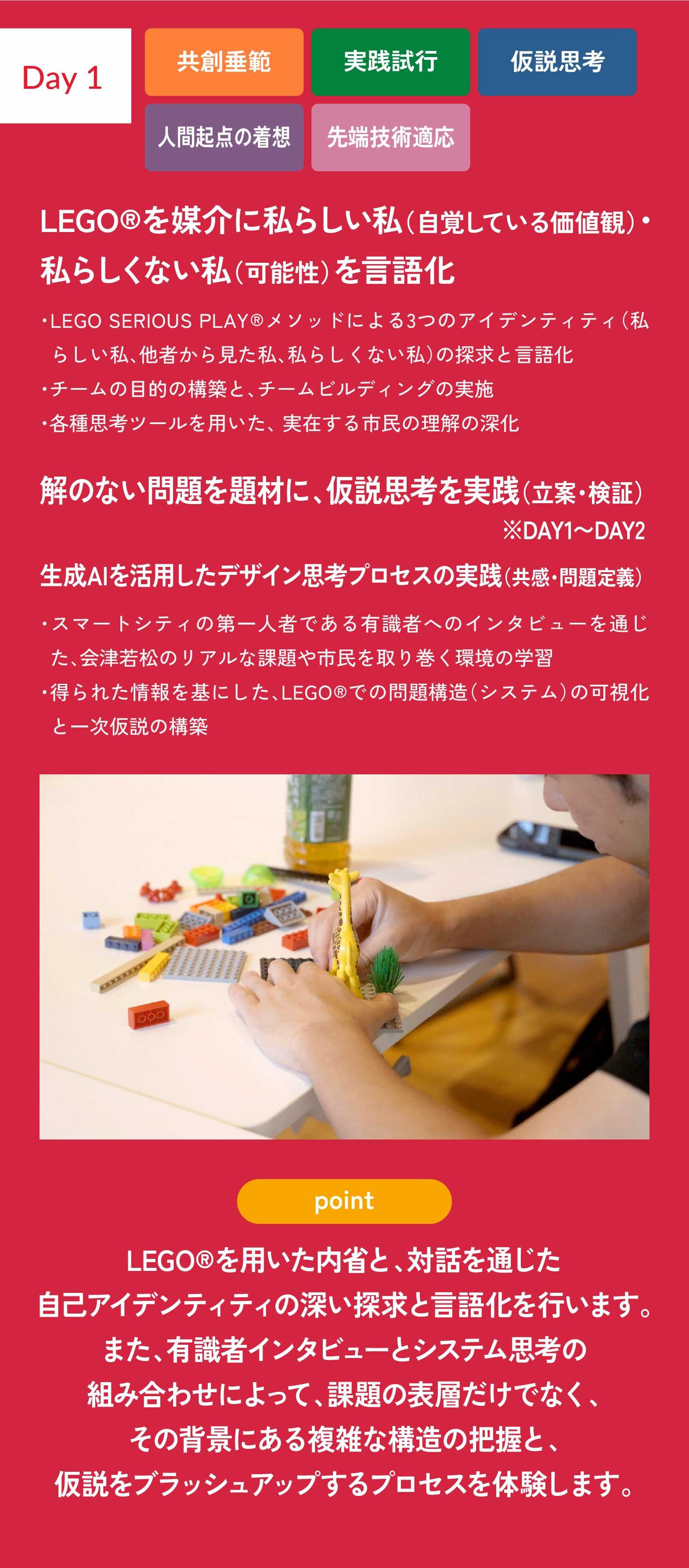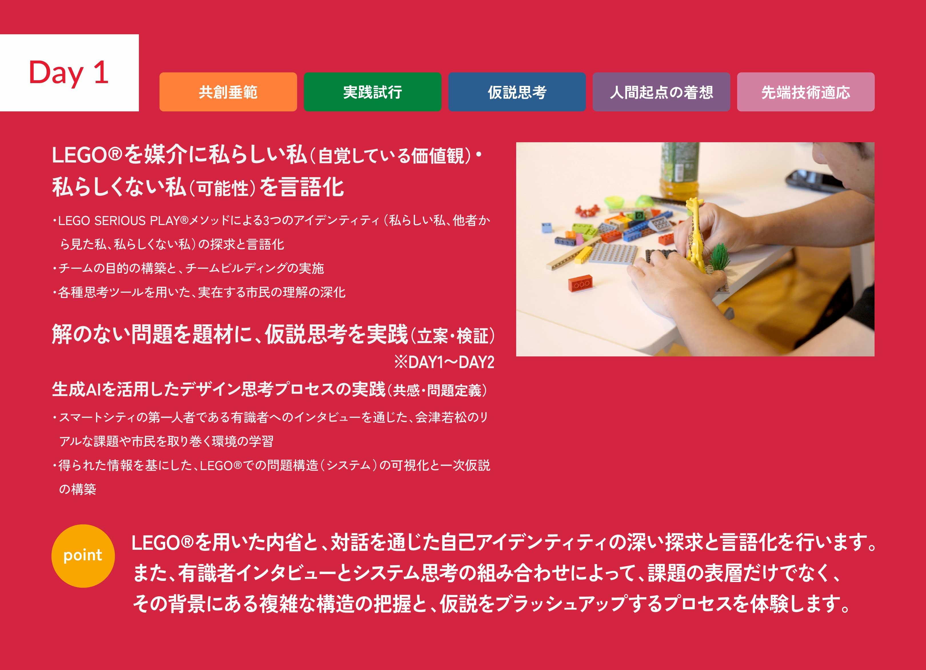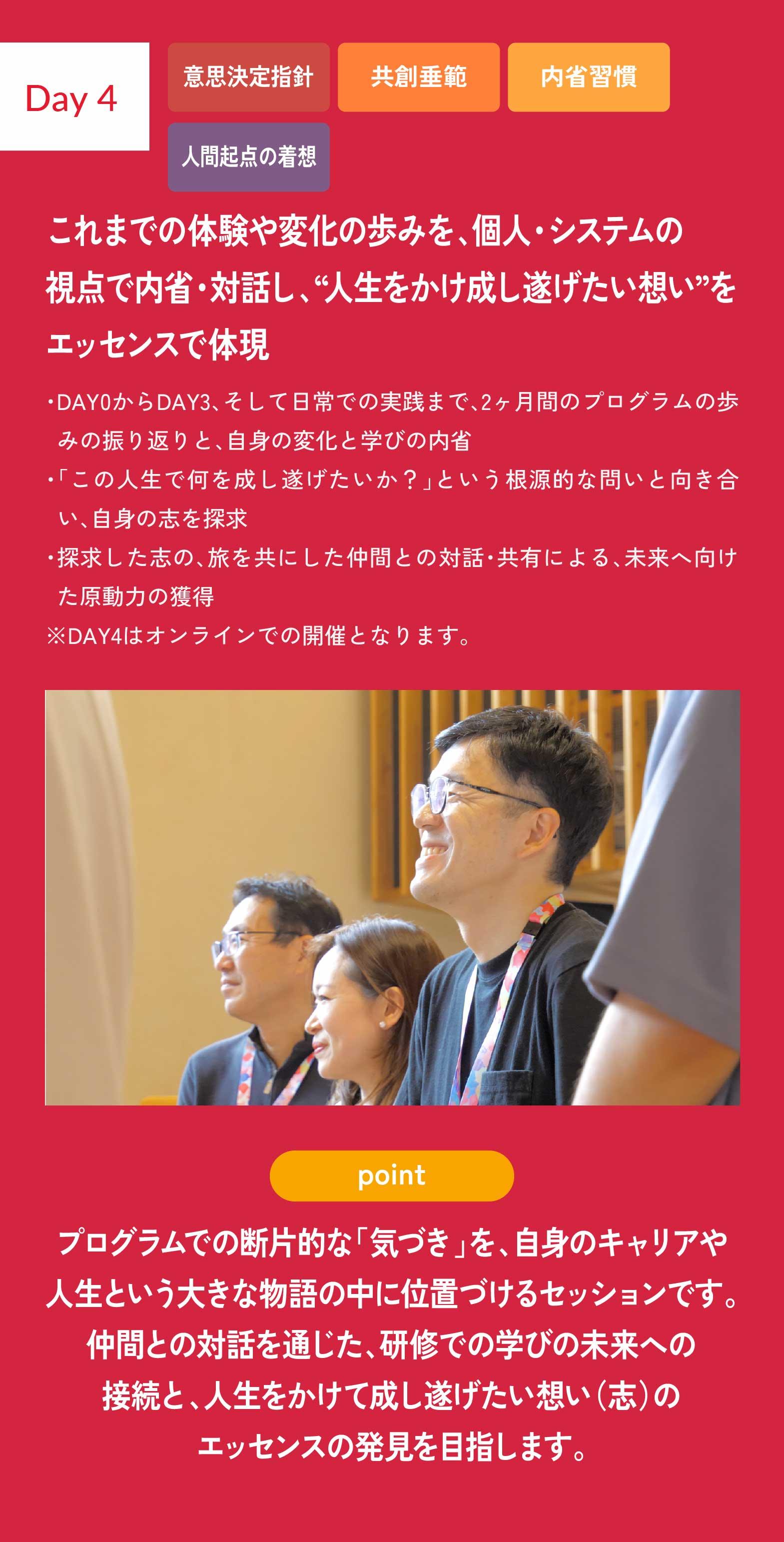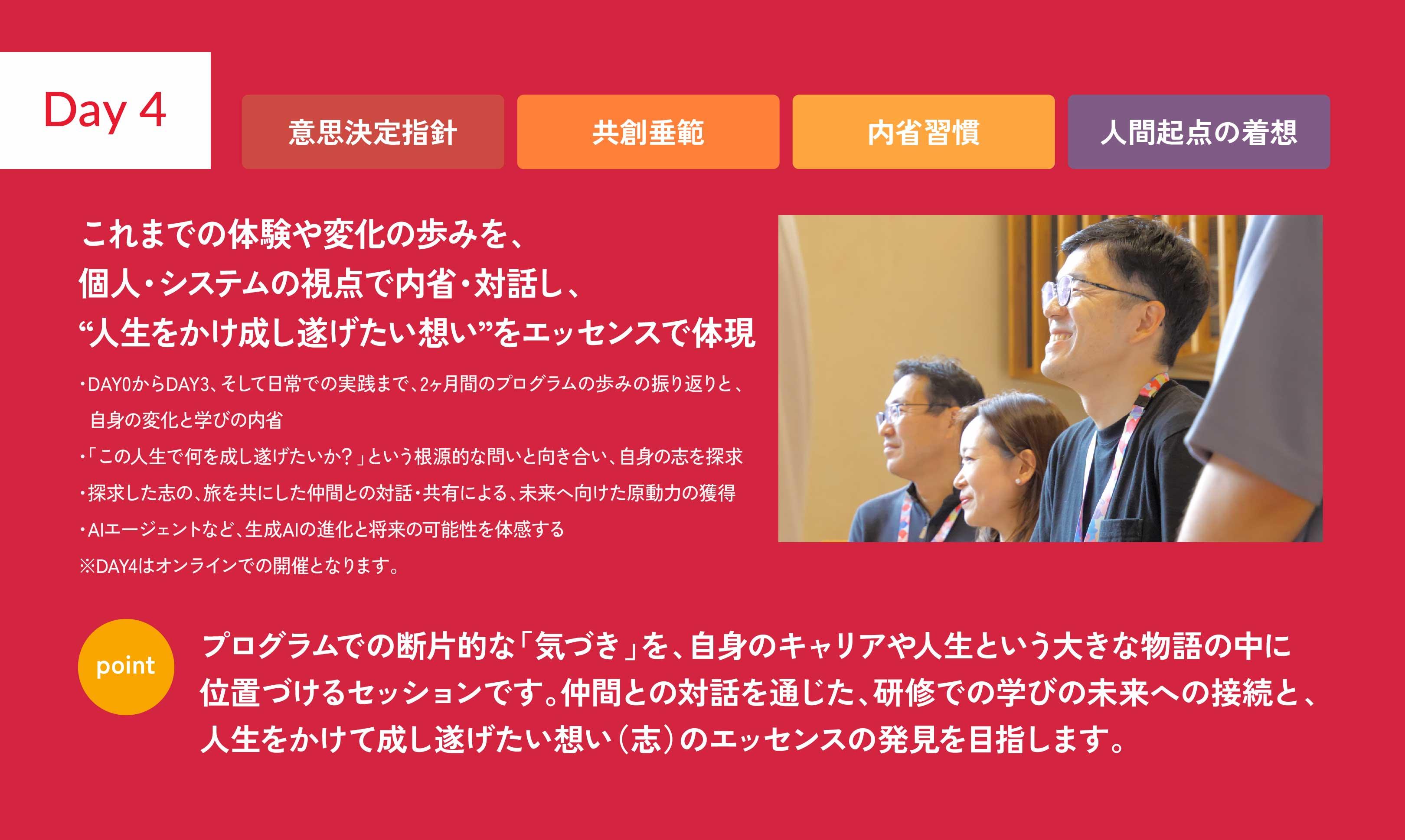 DAY0/AI活用×アイデア創出 ※オンラインセッション DAY1/アイデンティティの探求・仮説思考の実践 DAY2/フィールドワーク(市民インタビュー) DAY3/日常課題への対峙 DAY4/行動変容の内省・志の言語化 ※オンラインセッション |