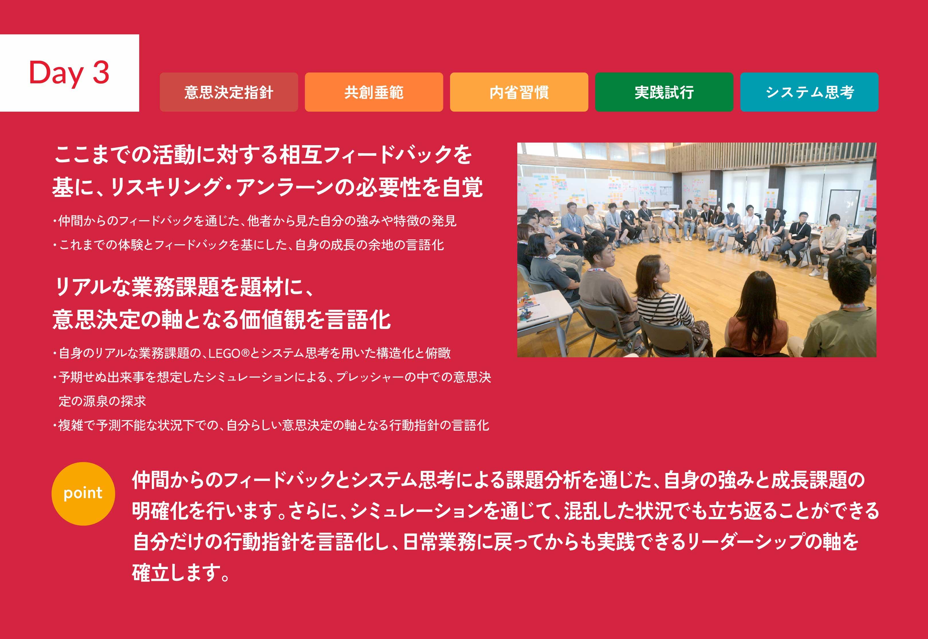 役職や会社といったバックボーンを離れ、全員が同じ目線で議論できたのが良かったです。普段は気づけない自分の内面と向き合う、この研修でしか得られない貴重な機会でした。